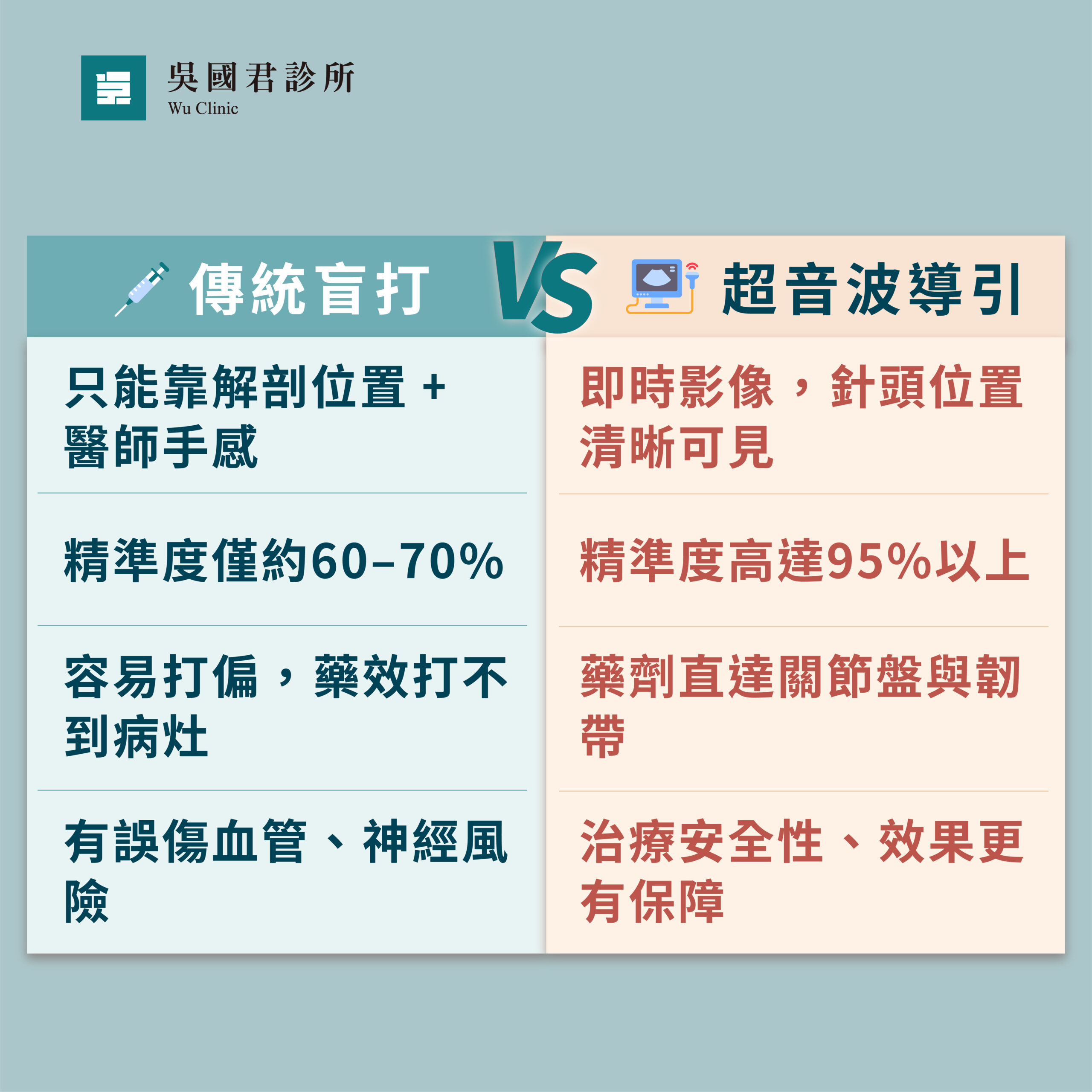 吳國君診所擁有黃金醫療團隊,能完整評估傷情,同時配有手術設備,手術到非手術治療一次搞定!